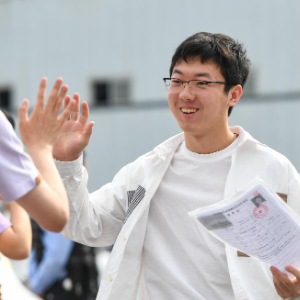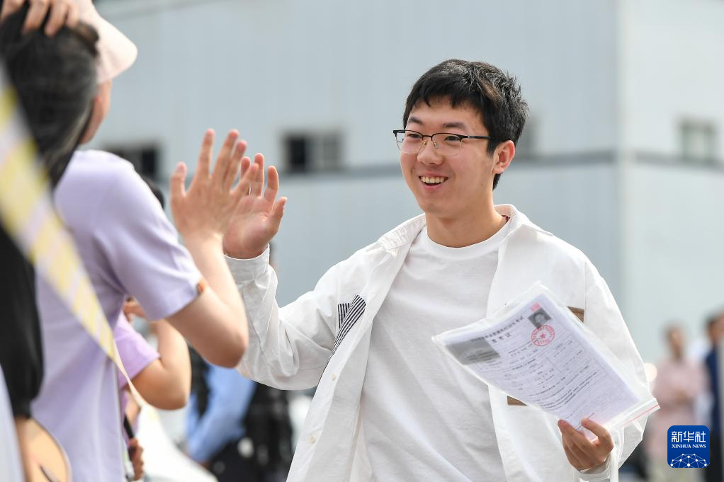 6月7日,在中国农业大学附属中学考点,一名来自清华附中的考生与老师击掌。