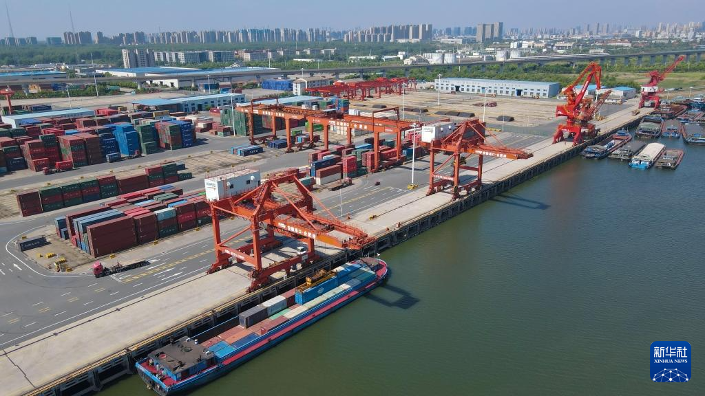 5月29日,船舶在合肥港国际集装箱码头卸货(无人机照片)。