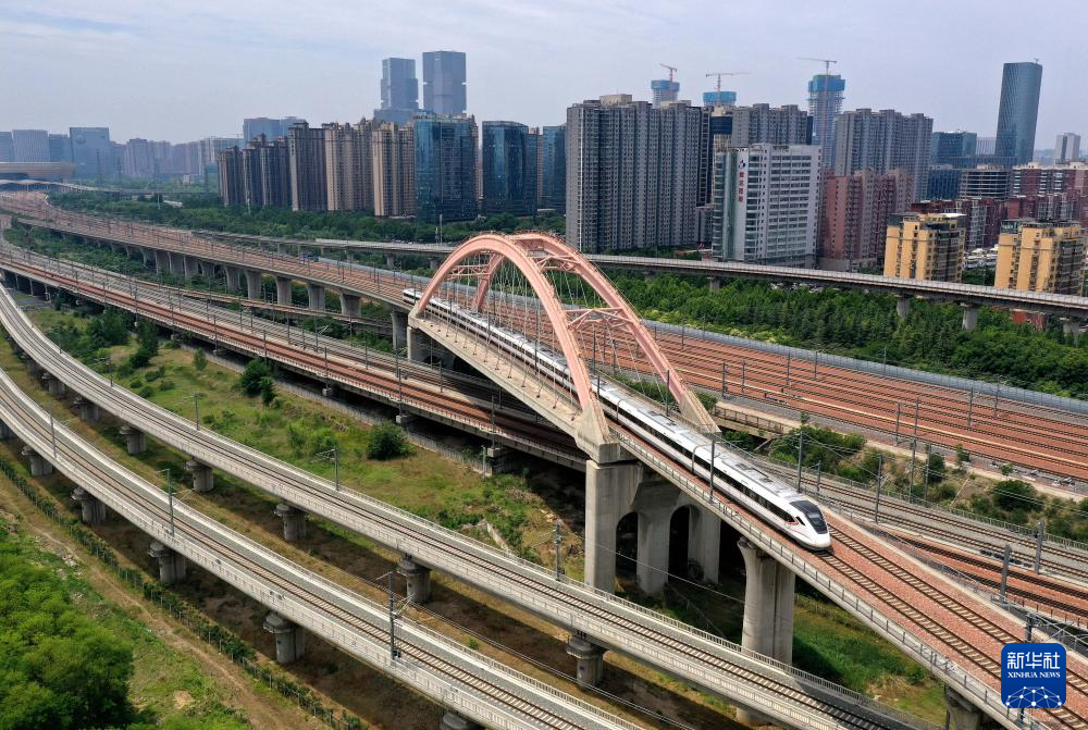 一列动车组列车行驶在郑州东站附近的线路上(5月30日摄)。