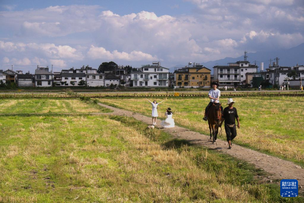 游客在喜洲古镇骑马、拍照(6月7日摄)。