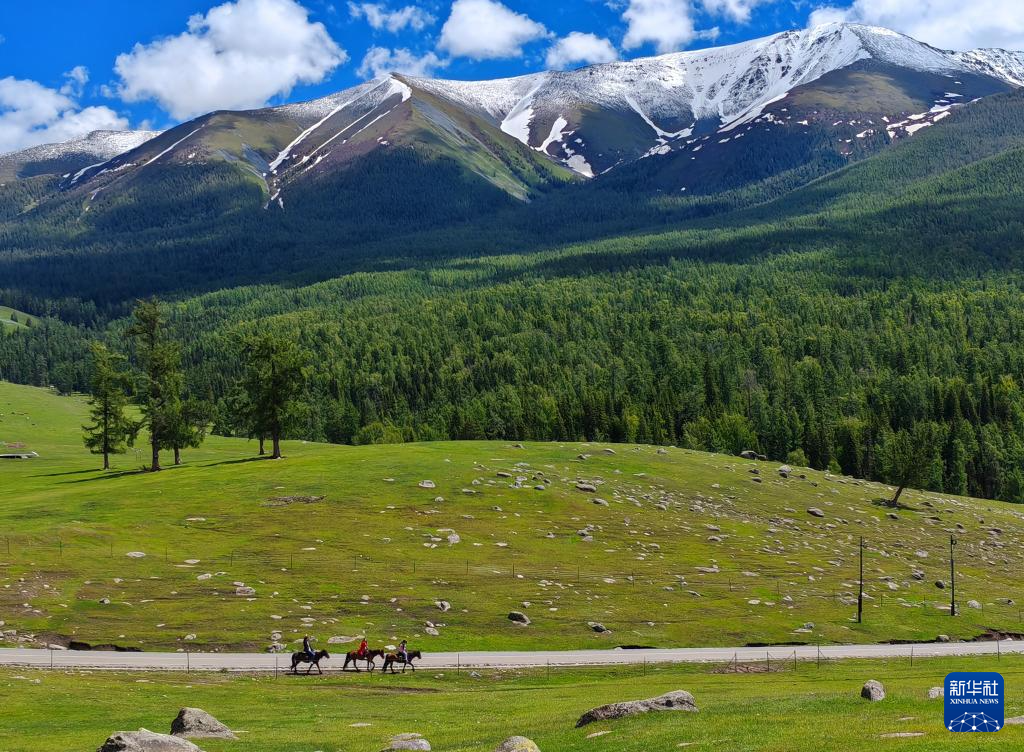 6月4日,在新疆阿勒泰地区哈巴河县,游客在骑马游玩。