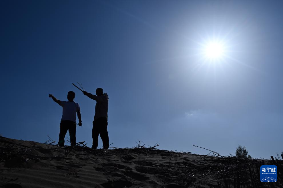6月5日,在位于内蒙古杭锦旗的库布其沙漠一处治沙点,李挺(左)查看治沙进展。