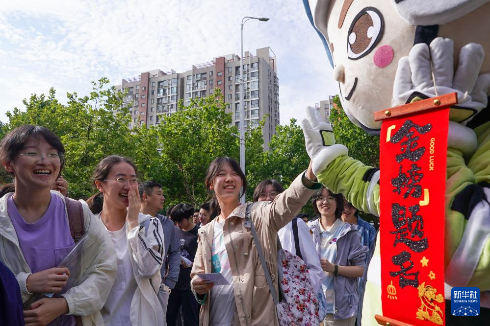 6月7日,在江苏省南京市建邺区中华中学考点,考生与送考人偶击掌。