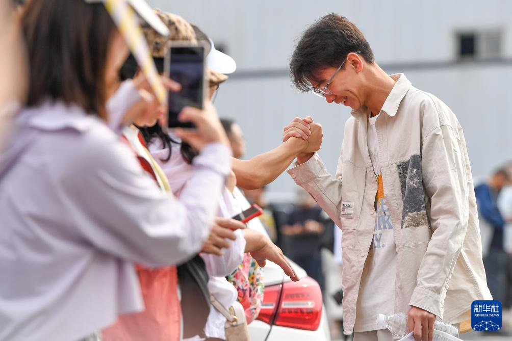 6月7日,在位于吉林长春的吉林省实验中学考点,考生入场前与老师握手加油。