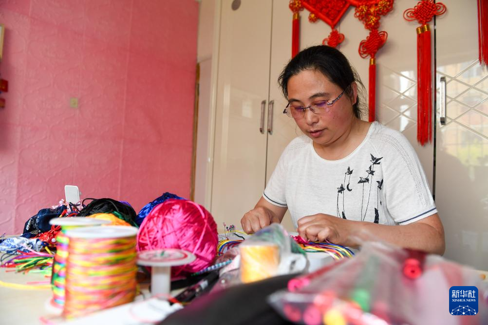 6月6日,姜红在位于吉林省四平市的家中创作绳结作品。