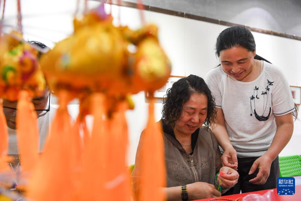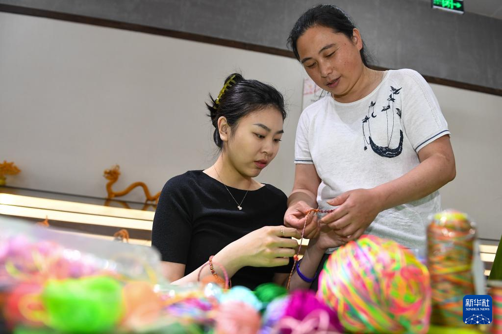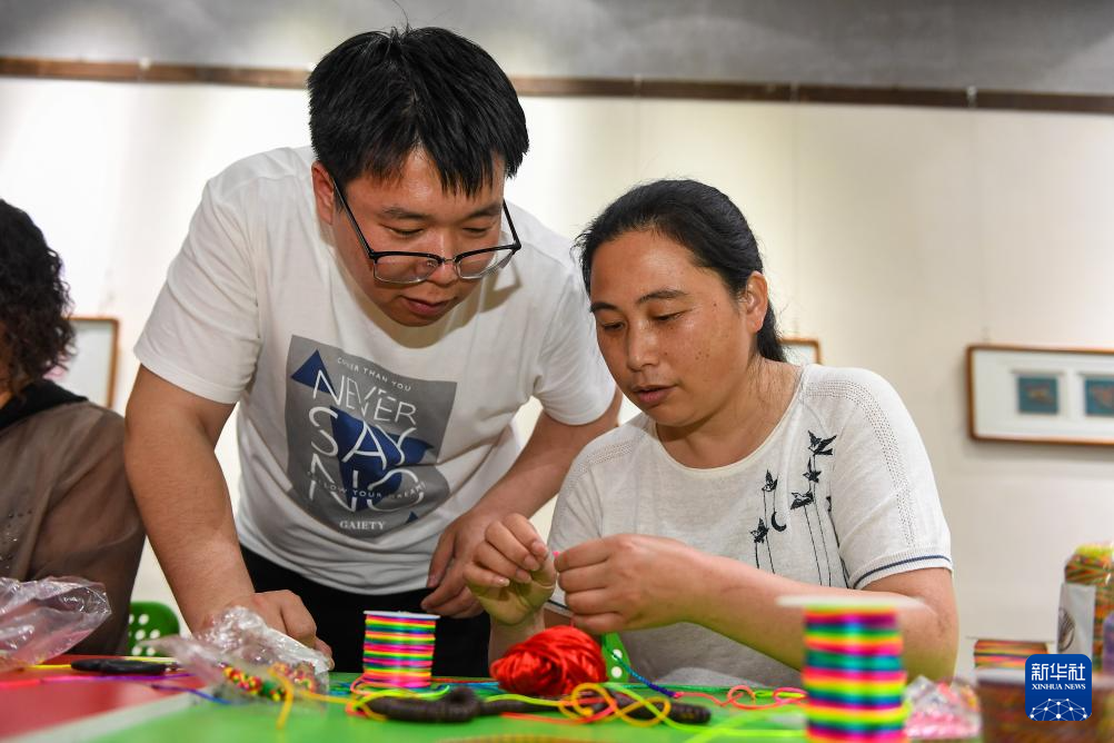 6月5日,在吉林省四平市博物馆,姜红(右)向市民传授绳结技艺。