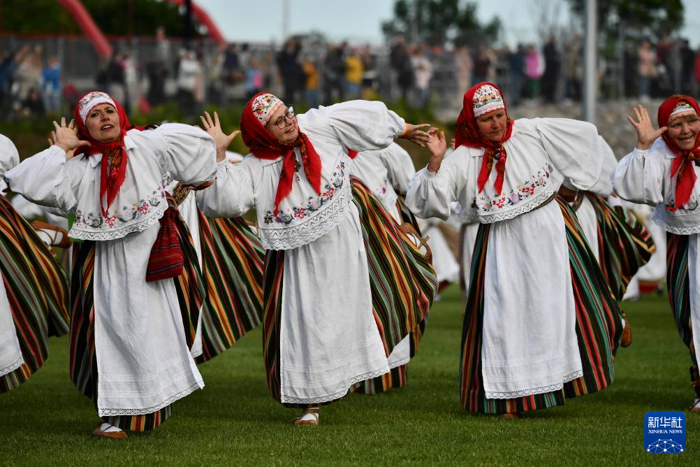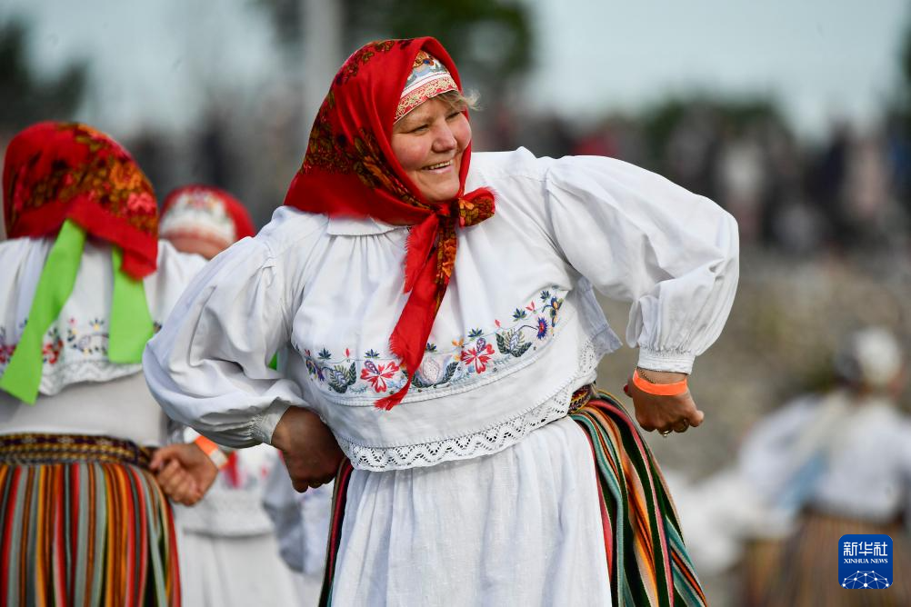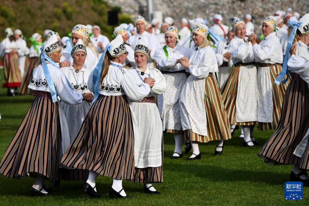 6月8日,在爱沙尼亚约赫维,人们身着民族传统服饰参加舞蹈庆典。