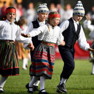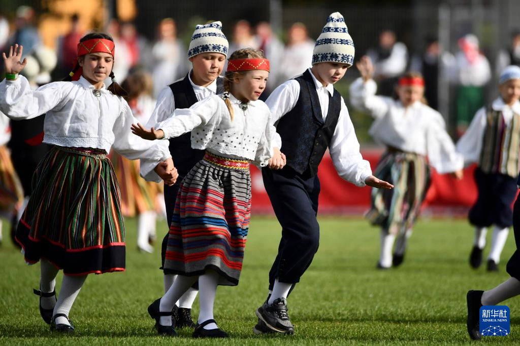 6月8日,在爱沙尼亚约赫维,孩子们身着民族传统服饰参加舞蹈庆典。