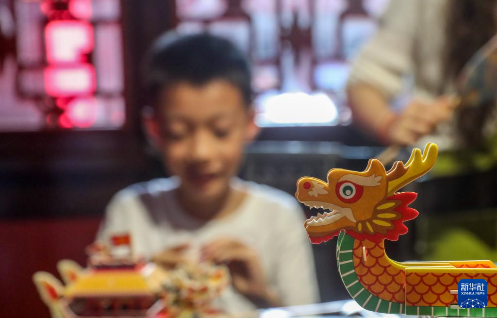 6月9日,小朋友在贵州省黔东南苗族侗族自治州镇远古城体验制作手工龙舟。