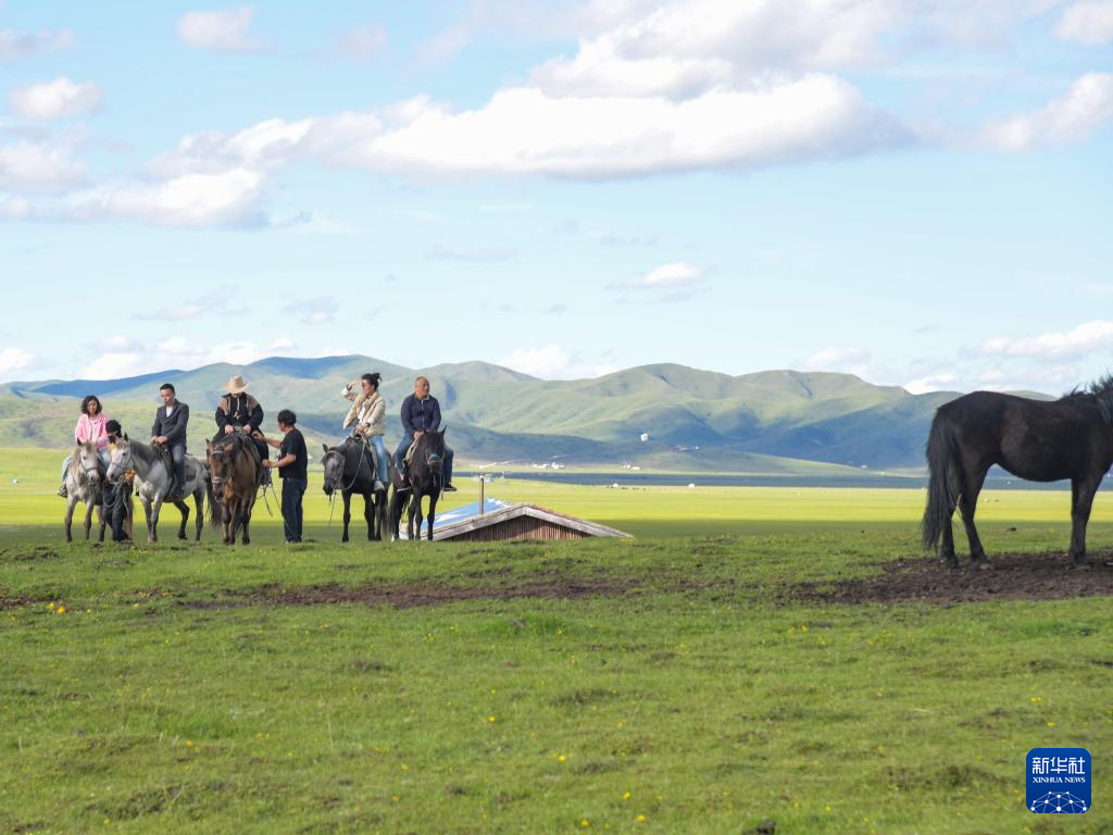 6月8日,游客在四川省阿坝藏族羌族自治州红原县日干乔湿地体验骑马。