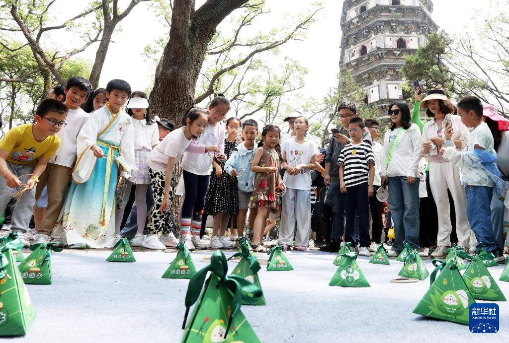 6月9日,在江苏苏州虎丘山景区,小朋友在体验“套粽子”游戏。