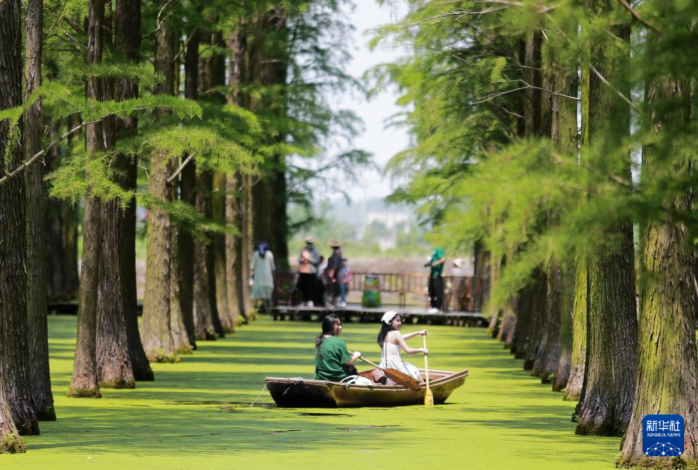 6月9日,游客在江苏省扬州市渌洋湖湿地公园的水上森林乘船游览。