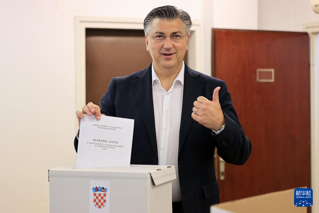 6月9日,克罗地亚总理普连科维奇在萨格勒布一处投票站参加欧洲议会选举投票。