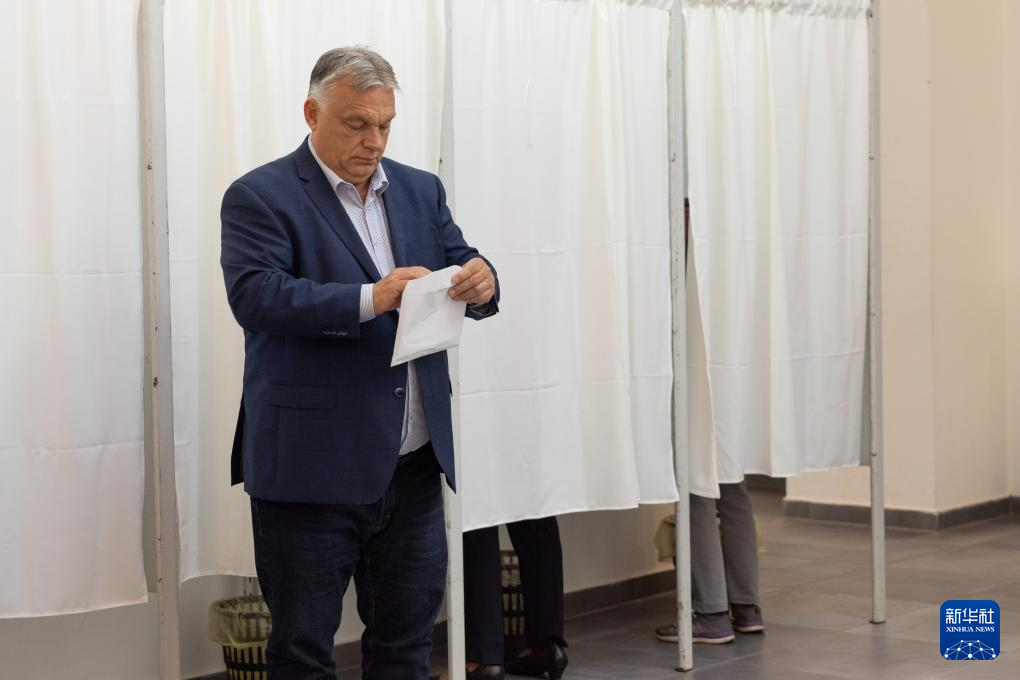 6月9日,匈牙利总理欧尔班在布达佩斯的一处投票站准备投票。