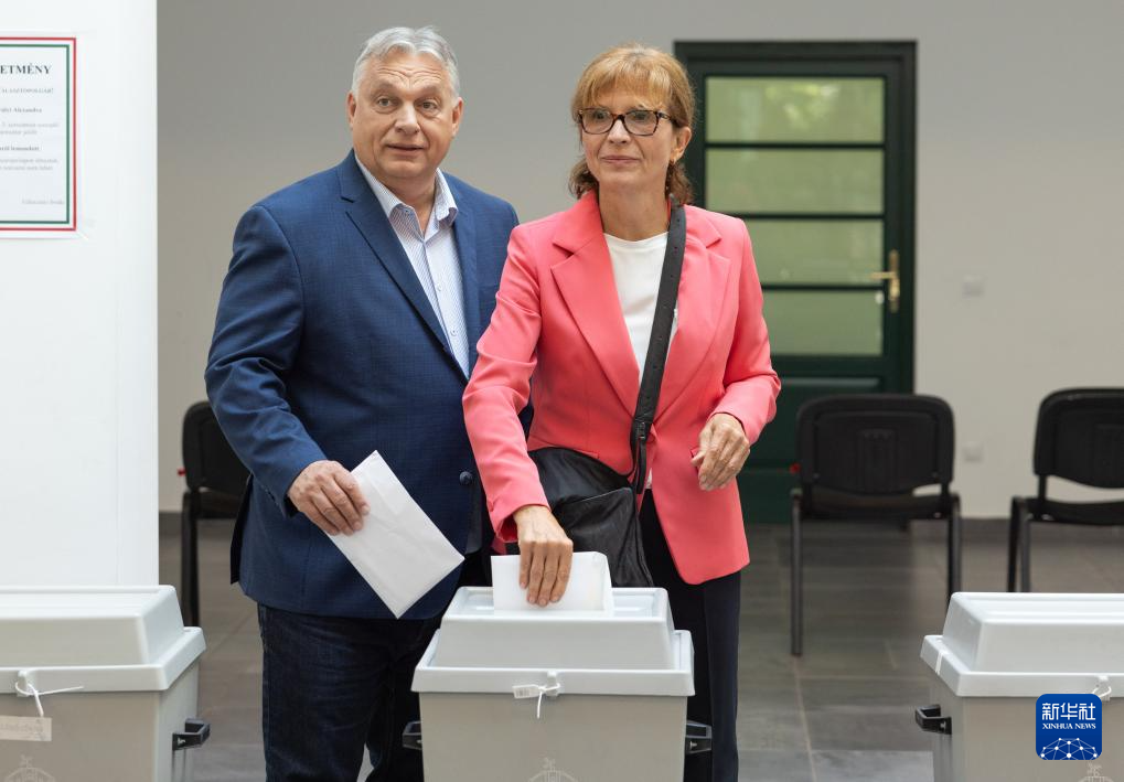 6月9日,匈牙利总理欧尔班(左)和夫人在布达佩斯的一处投票站投票。