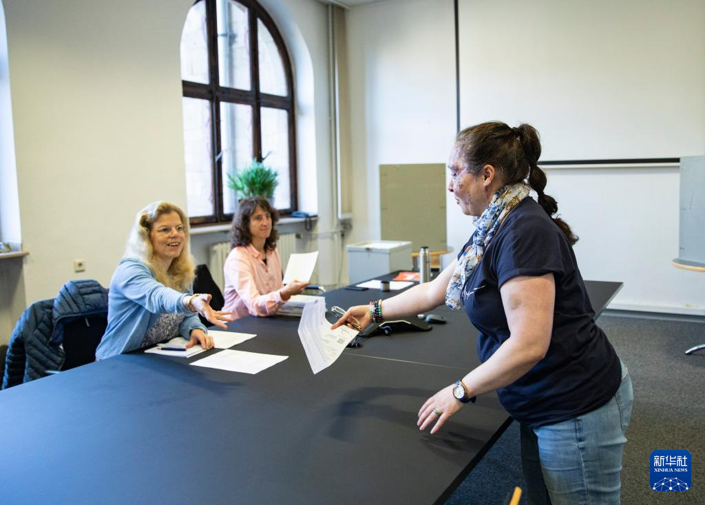 6月9日,选民在位于德国杜伊斯堡市政厅的投票点准备投票。