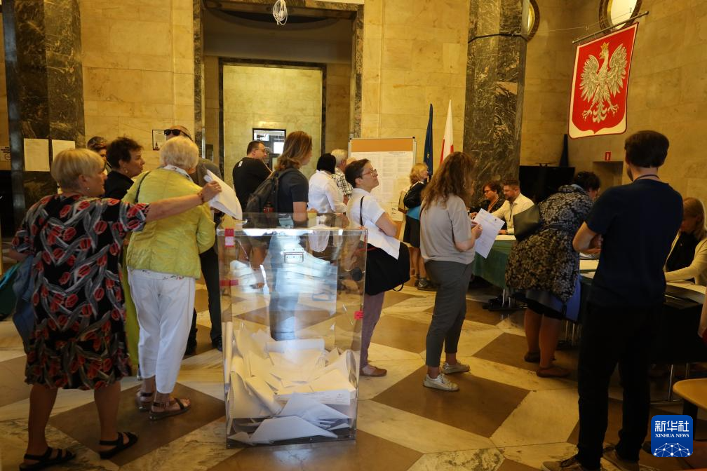 6月9日,选民在波兰华沙的地标性建筑科学文化宫参加选举。