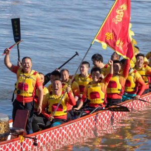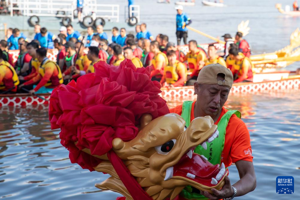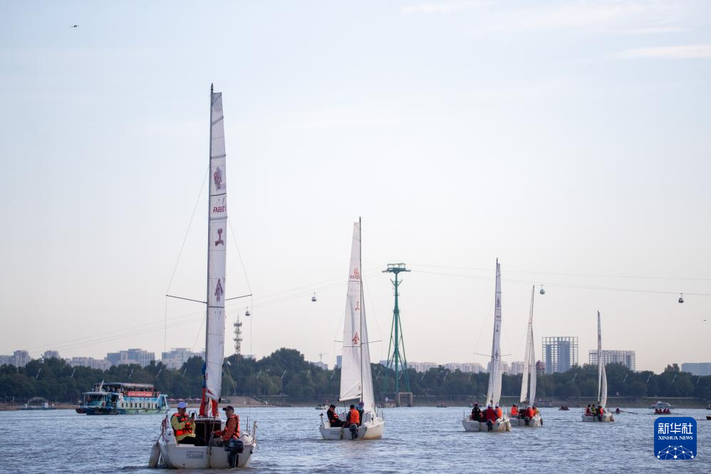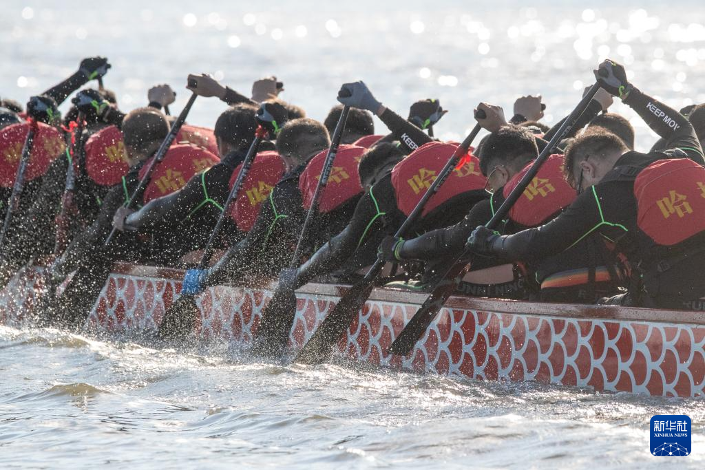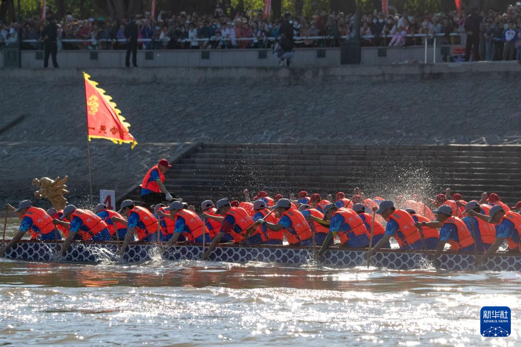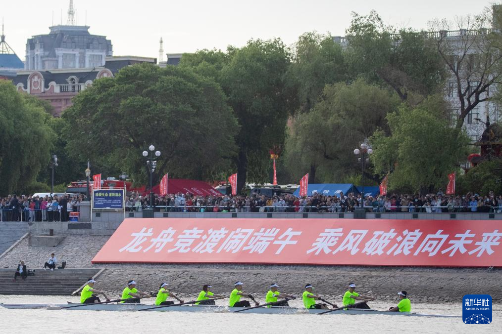 当日,哈尔滨市第二十八届端午节职工龙舟比赛在松花江上举行。赛艇、帆船和龙舟在江上竞逐展示,吸引众多游客和市民观看。