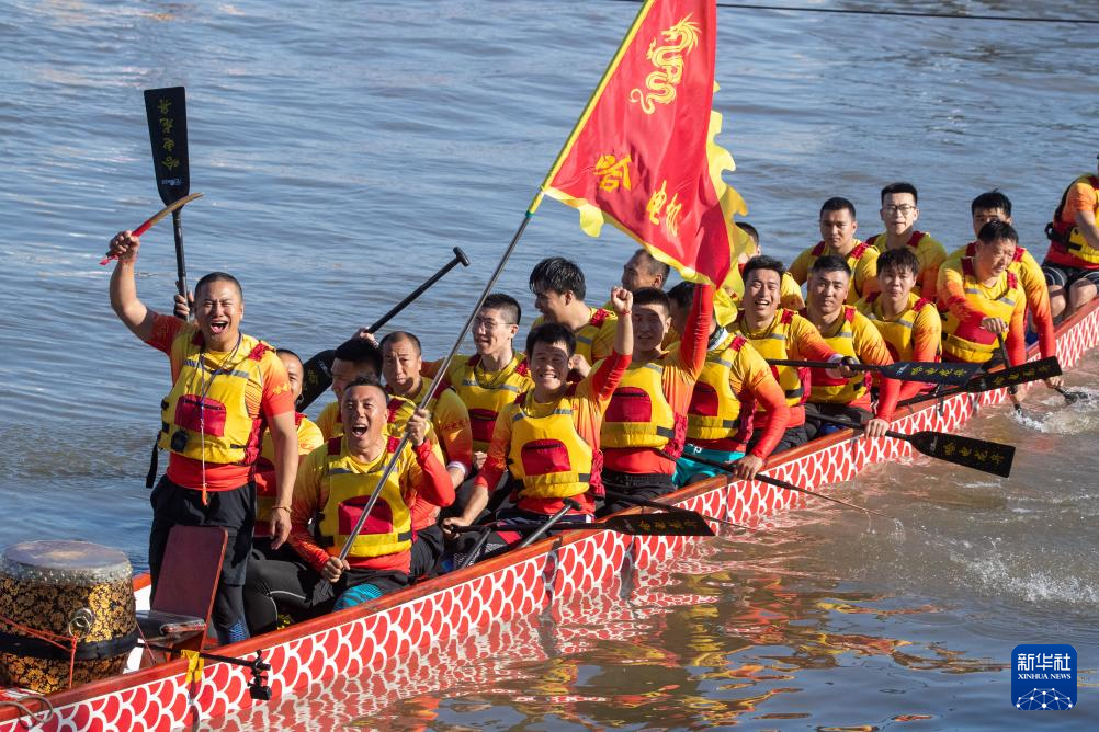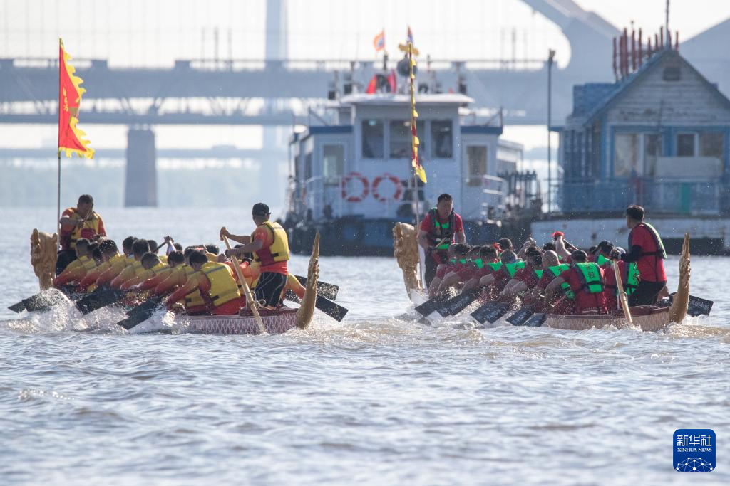 6月10日,选手在松花江哈尔滨市道里区段江面上参加龙舟比赛。