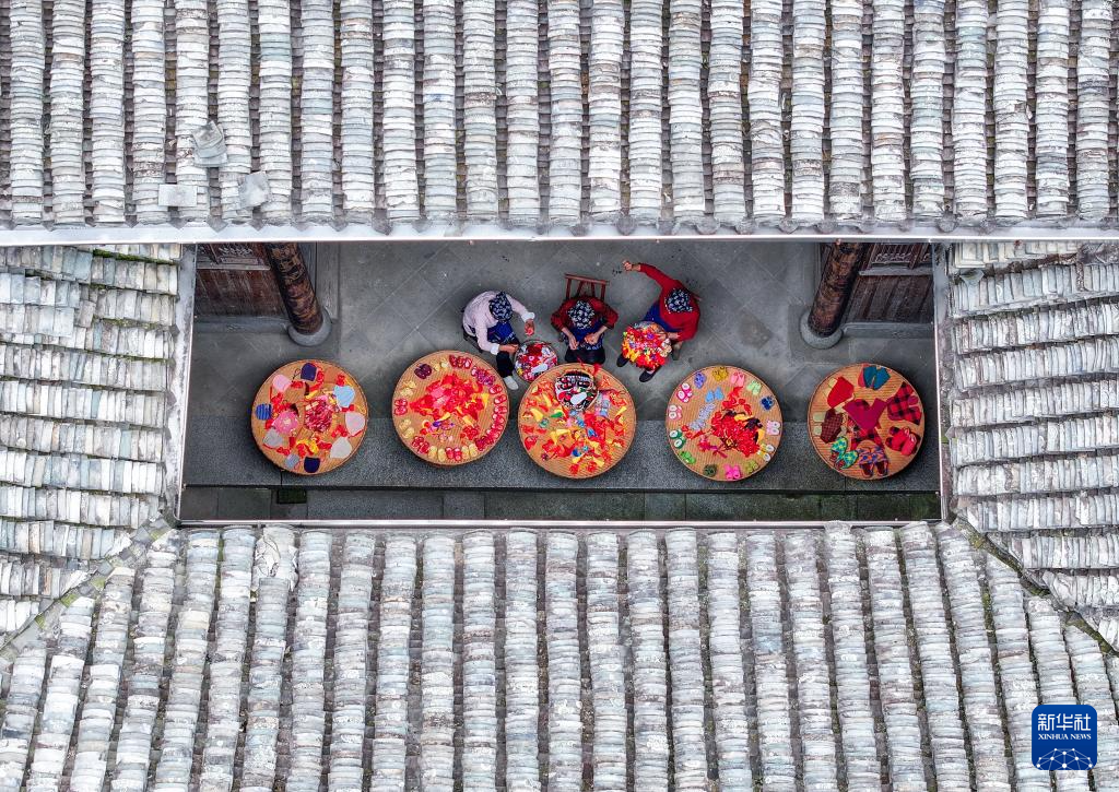 6月4日,在安徽省黄山市歙县许村镇许村,村民在手工缝制当地非遗饰品徽州“端午锦”(无人机照片)。