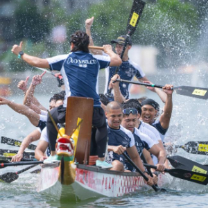 6月10日,参赛者在2024澳门国际龙舟赛中庆祝。