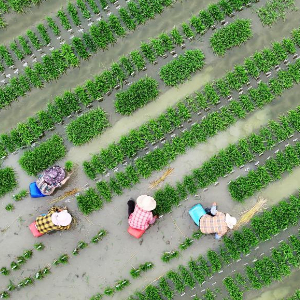 6月10日,湖南省常宁市洋泉镇农民在田间起秧苗(无人机照片)。