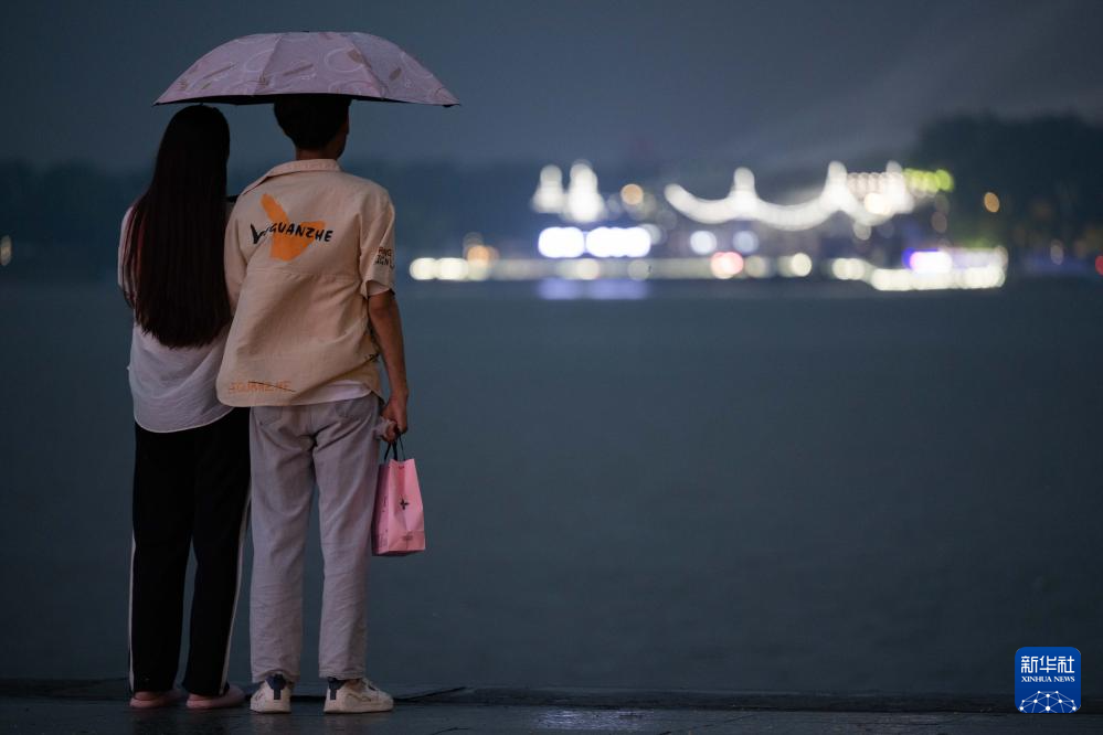 在哈尔滨市防洪纪念塔附近的松花江畔,一对情侣在雨中并肩观赏江景(6月11日摄)。