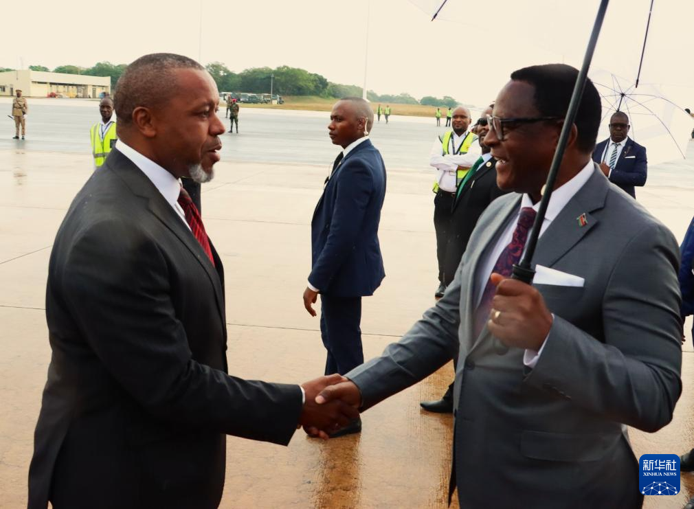 这是2023年11月14日,在马拉维首都利隆圭卡穆祖国际机场,马拉维总统查克维拉(右)与索洛斯·奇利马握手的资料照片。