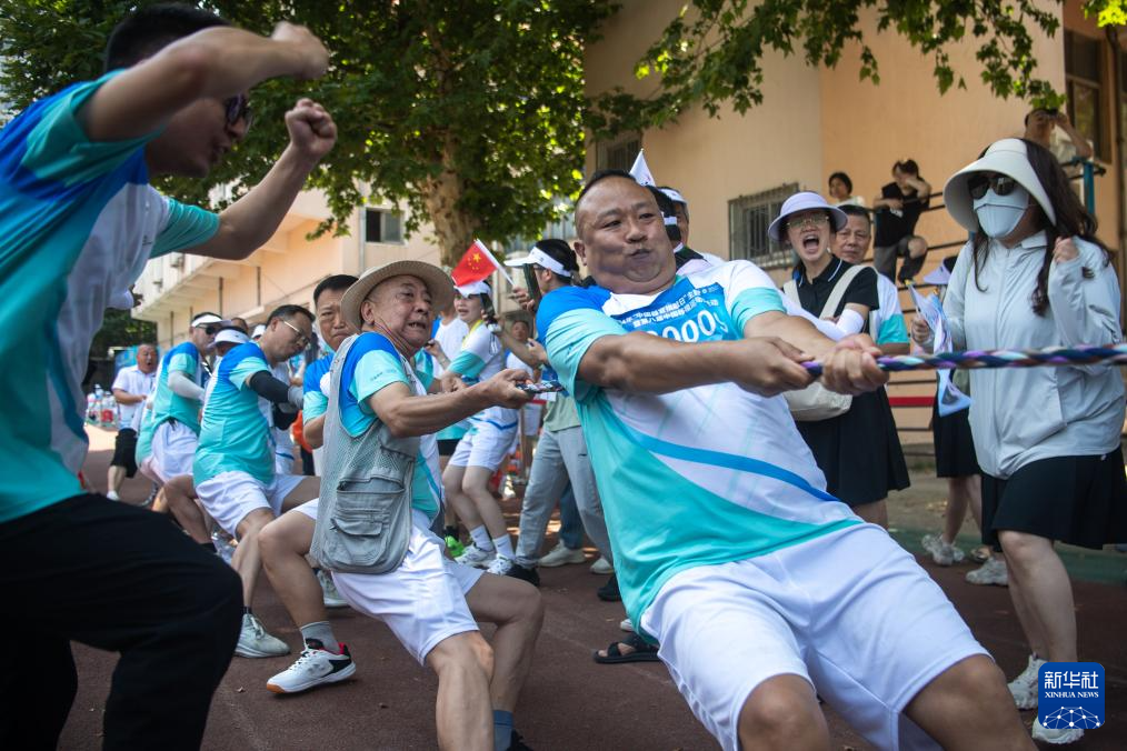 6月12日,参赛选手在拔河比赛中。