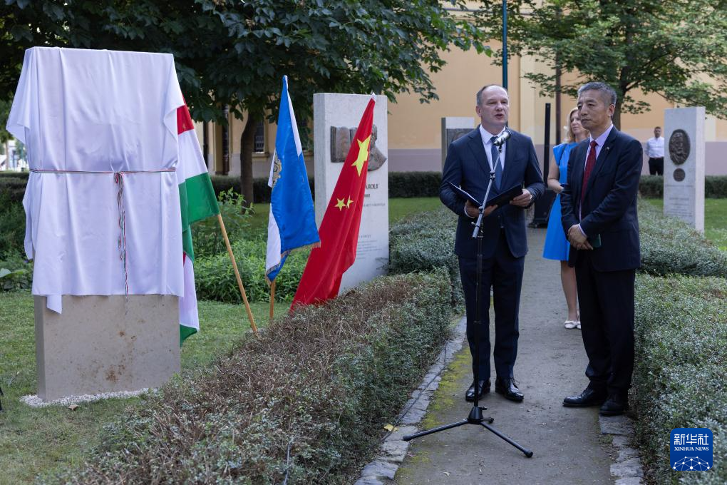 6月11日,在匈牙利基什孔弗莱吉哈佐,基什孔弗莱吉哈佐市长恰尼·约瑟夫(左)出席白莽纪念像落成揭幕仪式时致辞。