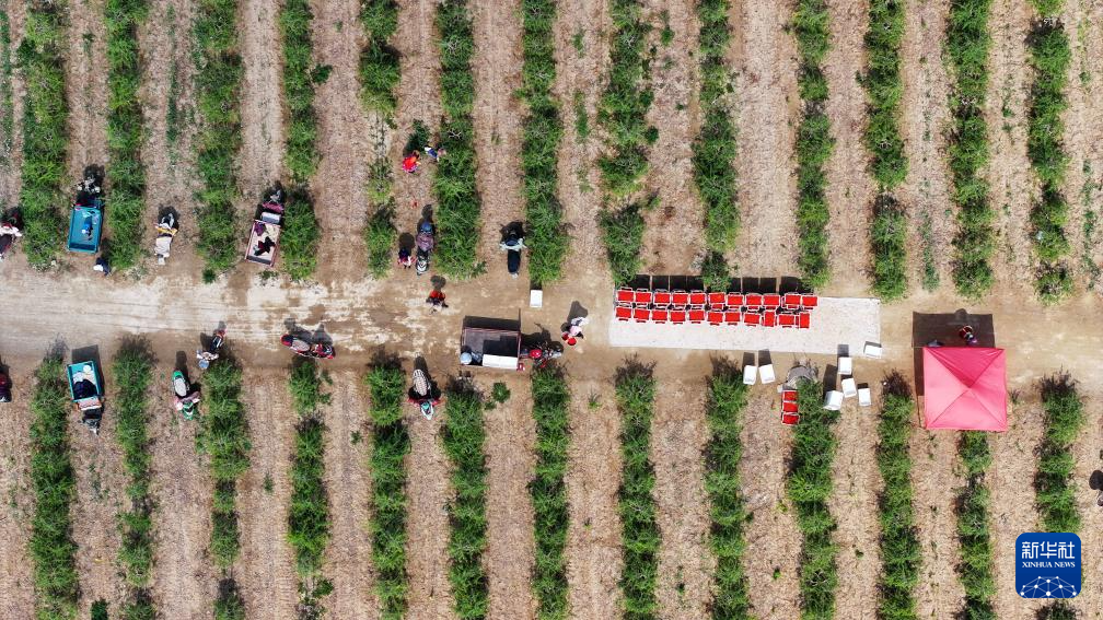 6月12日,采摘工在枸杞地里采摘枸杞(无人机照片)。