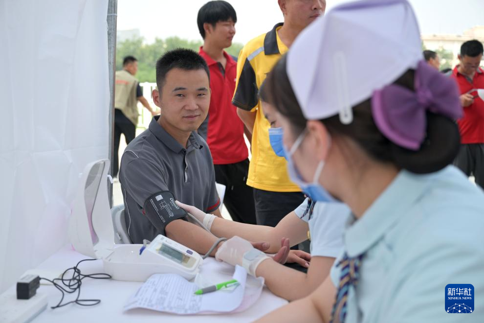 6月13日,在北京工人体育场举办的新就业形态劳动者移动体检活动上,快递小哥在测血压。
