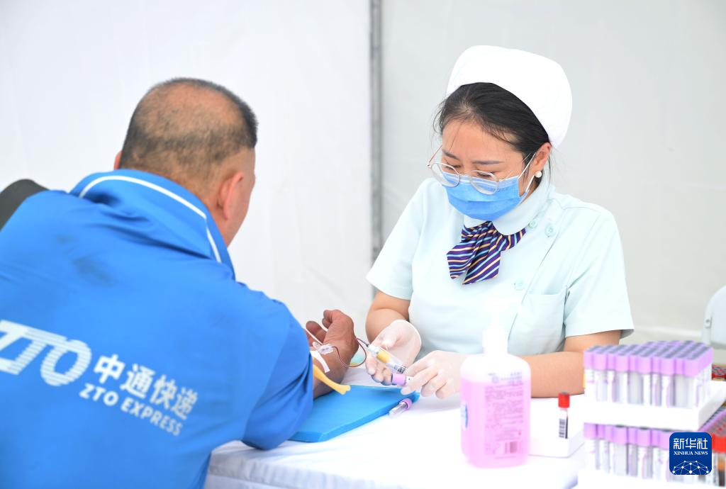 6月13日,在北京工人体育场举办的新就业形态劳动者移动体检活动上,快递小哥在做抽血检查。