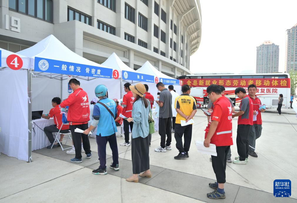 6月13日,在北京工人体育场举办的新就业形态劳动者移动体检活动上,新就业形态劳动者排队做体检。
