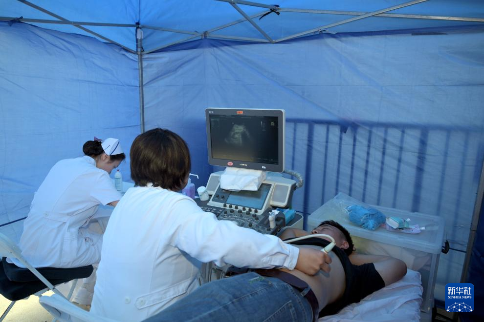6月13日,在北京工人体育场举办的新就业形态劳动者移动体检活动上,快递小哥在做彩超检查。