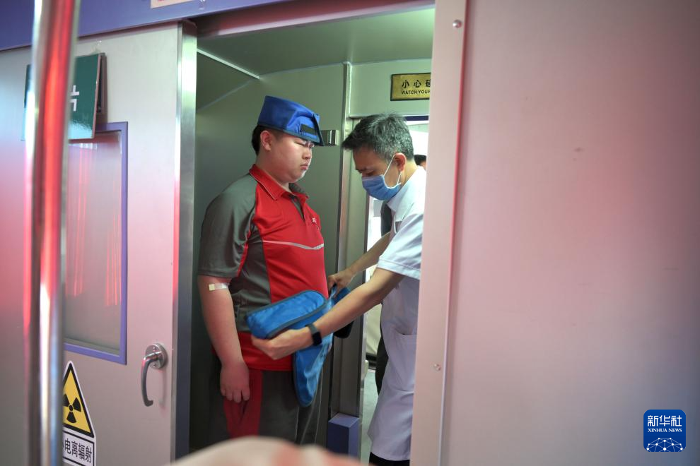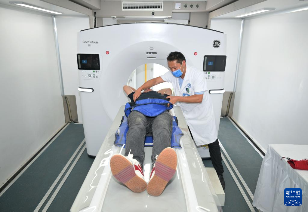 6月13日,在北京工人体育场举办的新就业形态劳动者移动体检活动上,快递小哥在移动体检车上做肺部CT检查。