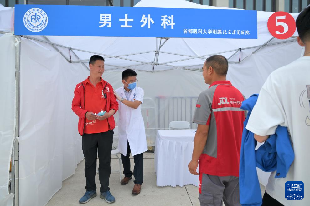6月13日,在北京工人体育场举办的新就业形态劳动者移动体检活动上,快递小哥在做男士外科检查。
