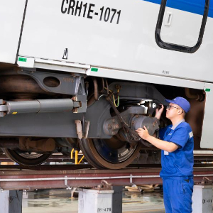 6月14日,在上海动车段南翔动车运用所,地勤机械师黎鹏(左)、夏迅对CRH1E-1071动车组转向架进行检查。