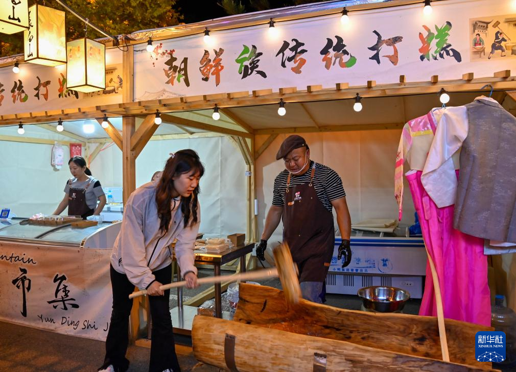 6月13日,游客在二道白河镇的云顶市集体验朝鲜族传统打糕。
