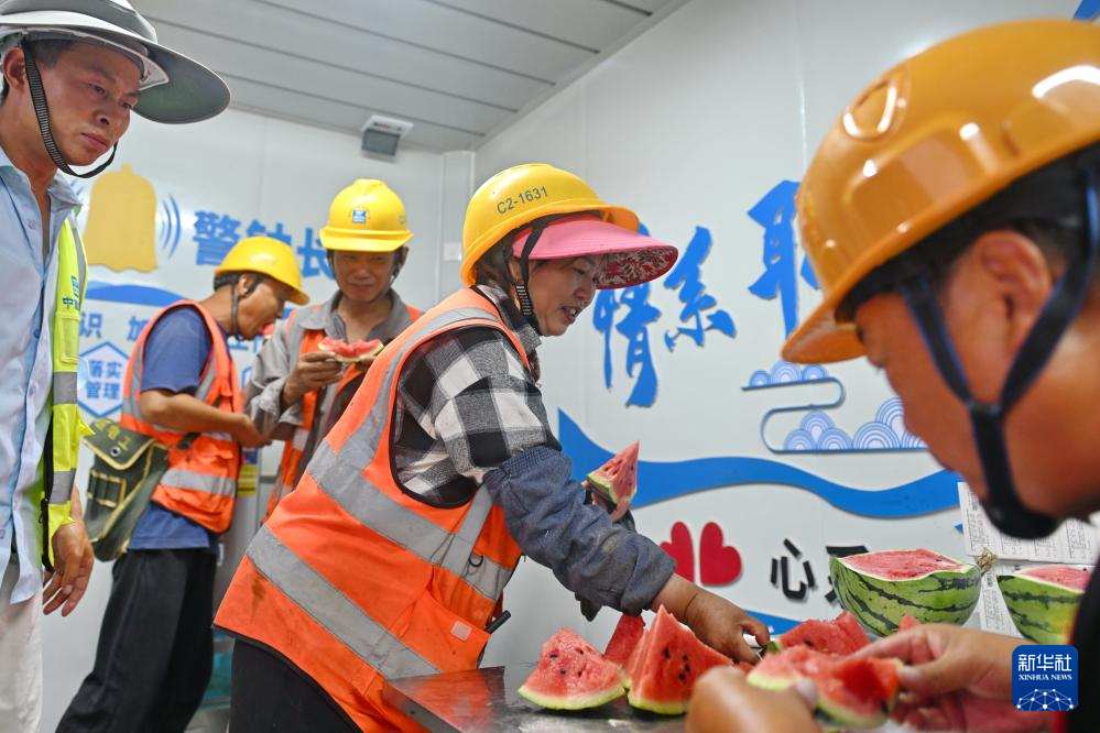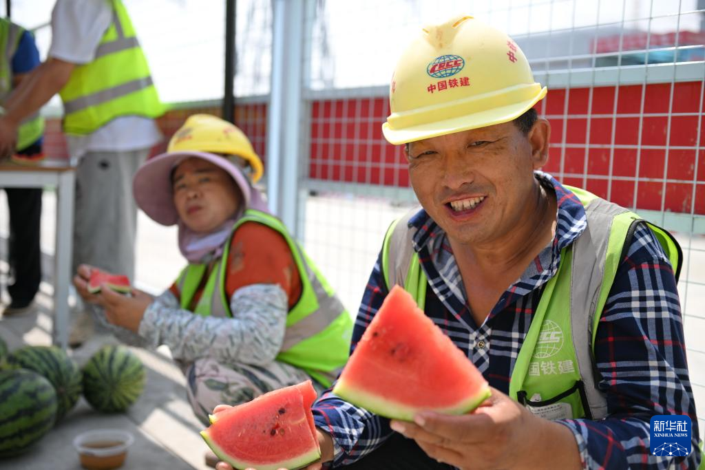 6月13日,在雄安新区启动区,中国建筑股份有限公司工人在雄忻高铁雄安地下段及相关配套工程四标段项目一处“工友驿站”内吃西瓜解暑。
