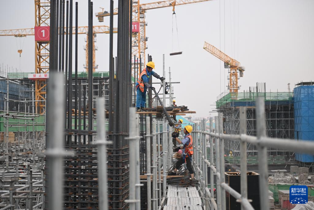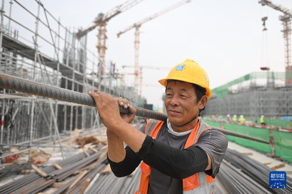 6月13日,在雄安新区启动区,中国建筑股份有限公司工人在雄忻高铁雄安地下段及相关配套工程四标段建设现场搬运钢筋。