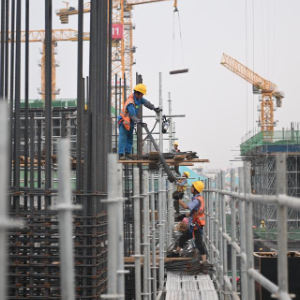6月13日,在雄安新区启动区,中国建筑股份有限公司工人在雄忻高铁雄安地下段及相关配套工程四标段建设现场作业。