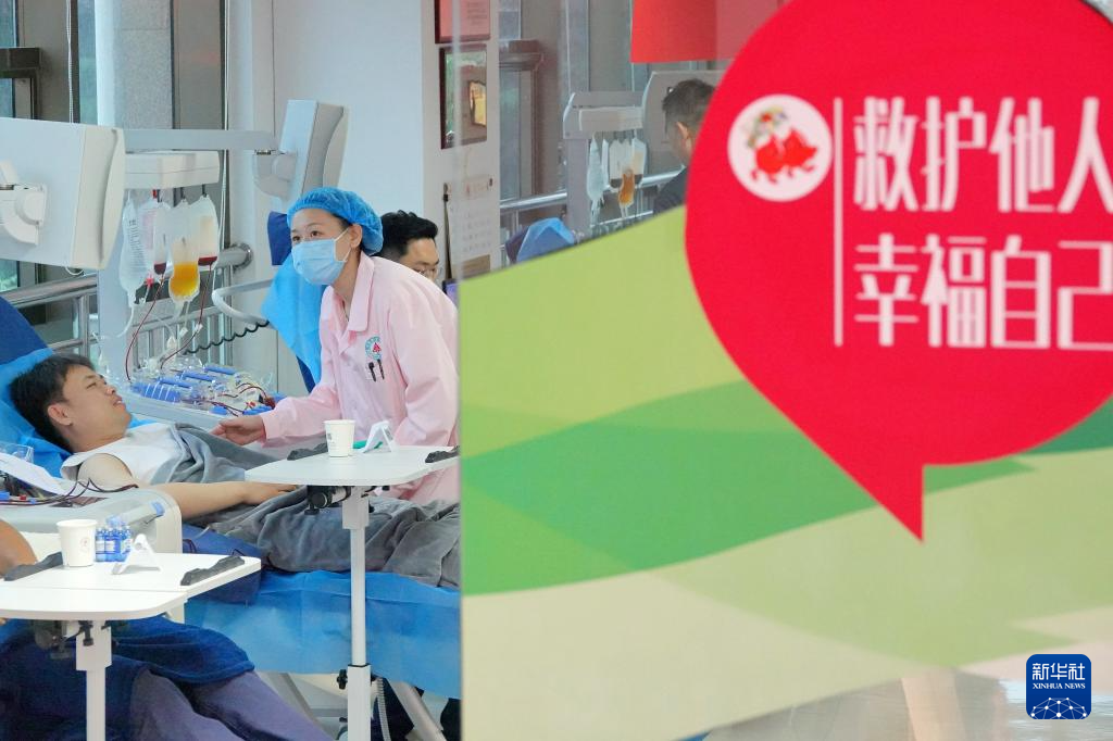 6月14日,在山东省烟台市中心血站,护士查看一名献血者的状态。