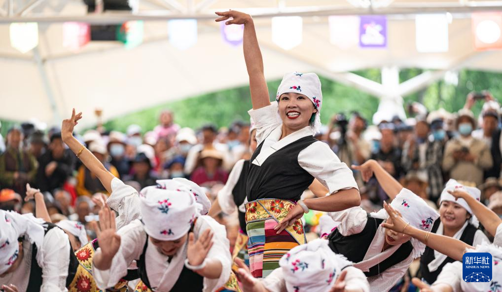 6月14日,参赛者在第二届拉萨锅庄舞大赛现场表演。