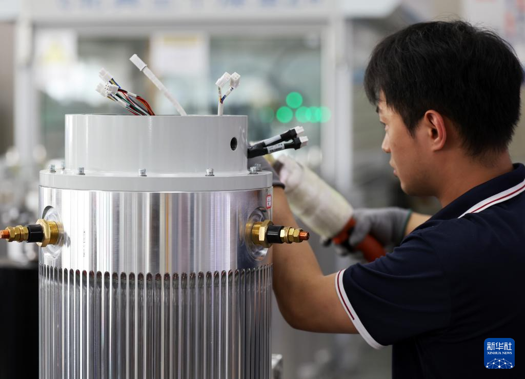 6月13日,工作人员在沈阳微控飞轮技术股份有限公司车间内检测转子。沈阳微控飞轮技术股份有限公司成立于2018年,深耕飞轮储能领域,以磁悬浮飞轮技术成为一家“独角兽”企业,其产品最高转速可达41000转/分钟。
