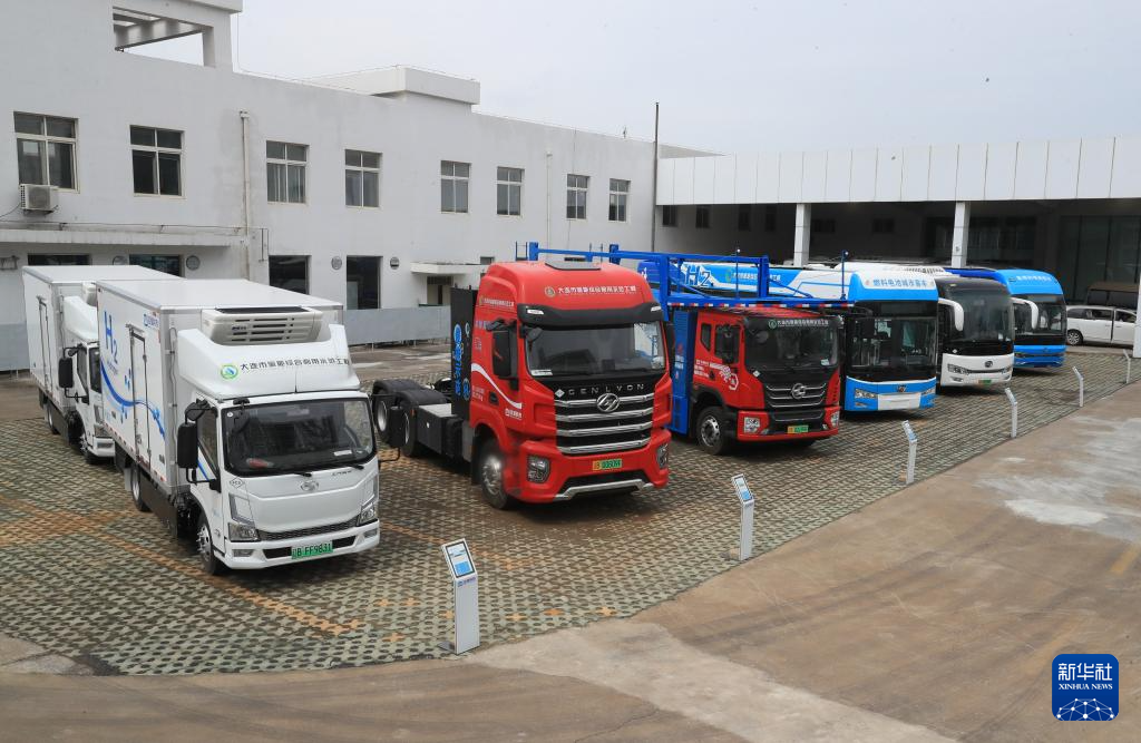 6月14日在洺源科技(大连)有限公司拍摄的使用燃料电池的客车、重型牵引车和货车。洺源科技(大连)有限公司瞄准氢能与燃料电池行业,专注于氢燃料电池动力系统研发、制造、销售,提供燃料电池车辆运营以及优质动力系统解决方案。
