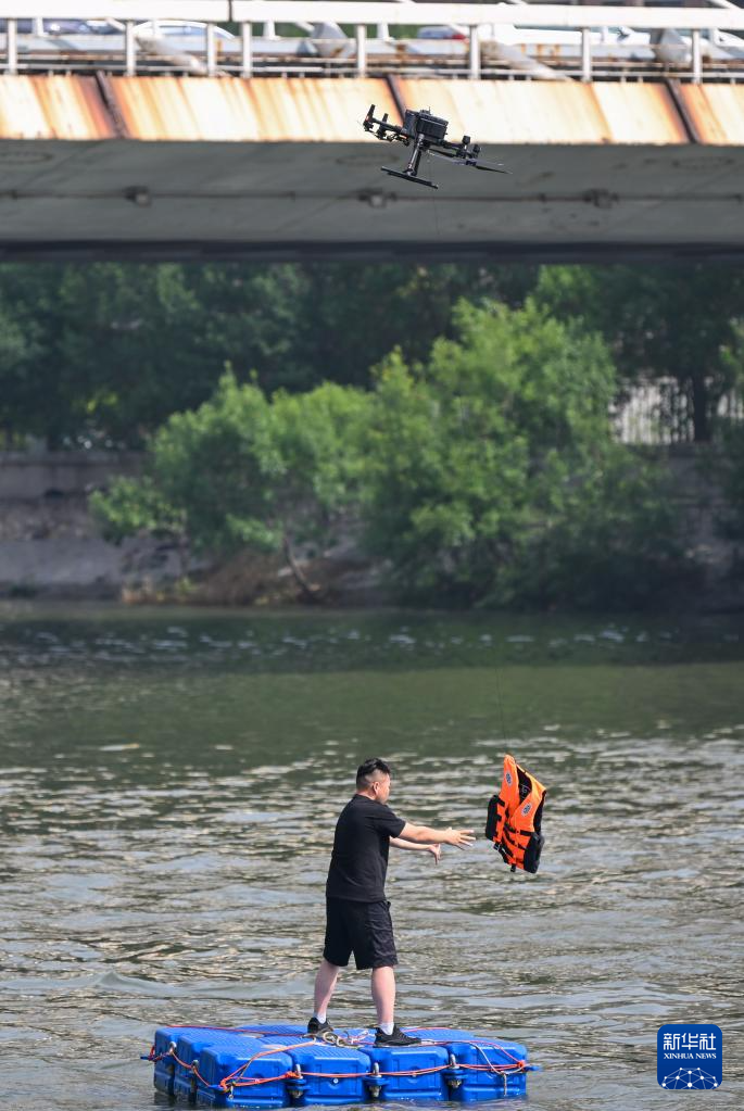 6月15日,救援人员演练利用无人机运送救生衣给水面被困人员。