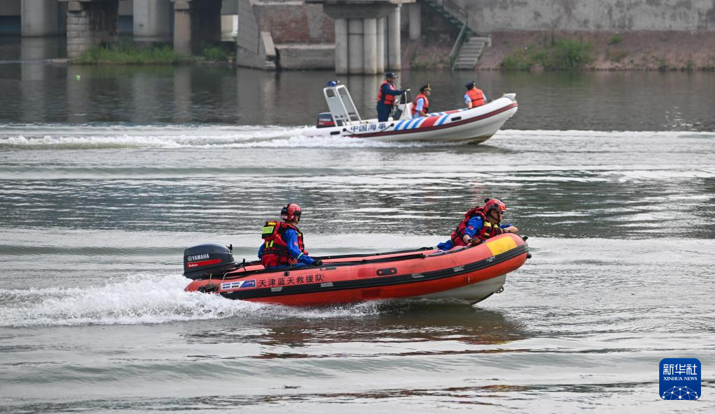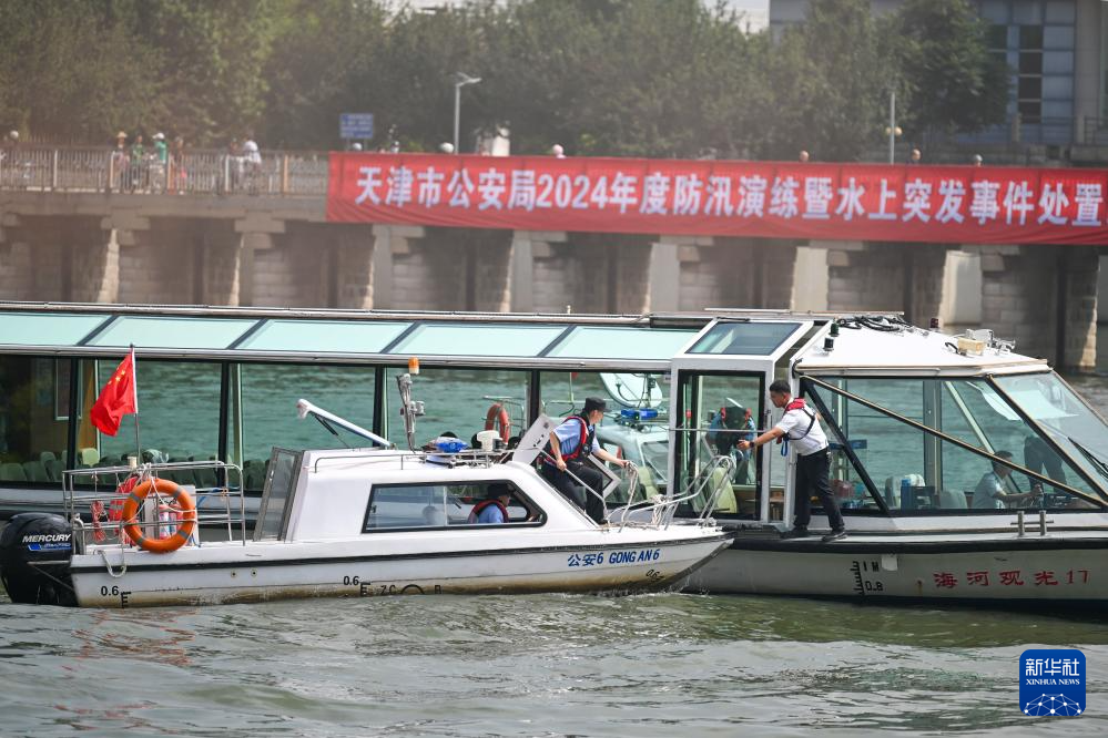 当日,天津市公安局、市消防救援总队、市港航局等相关部门在天津海河耳闸水域联合开展2024年防汛救援演练。