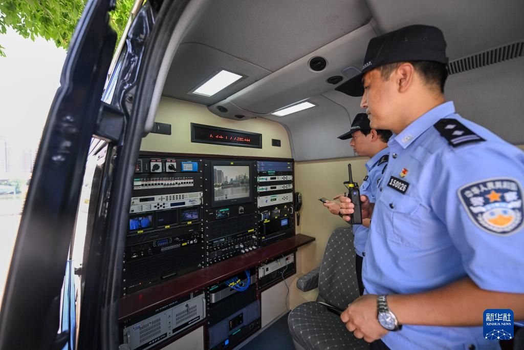 6月15日,天津市公安局大数据实战中心民警在“动中通”卫星通信车上为前方救援提供数据支持。