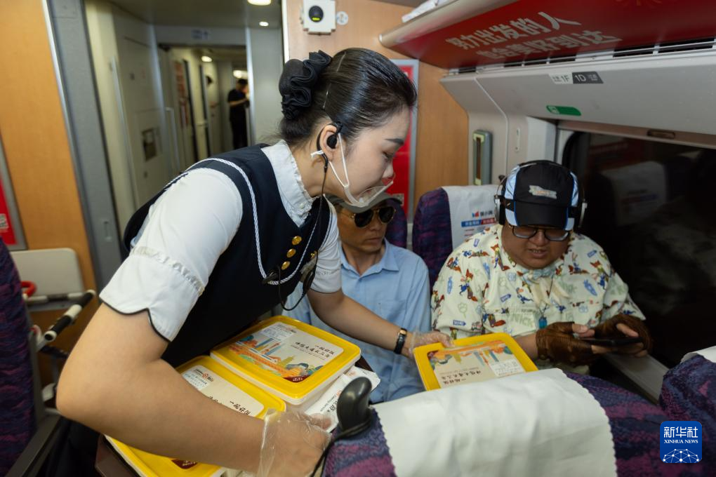 6月15日,在G8388次列车上,工作人员为旅客送上餐食。